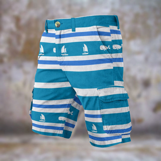 Nautical Blue Sailboat Striped Men’s Cargo Pants Cruising Beach Wear