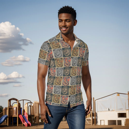 Men’s Vintage Postage Stamp Button-Up Shirt Beige & Tan Lightweight Cruise Travel Shirt Retro Re