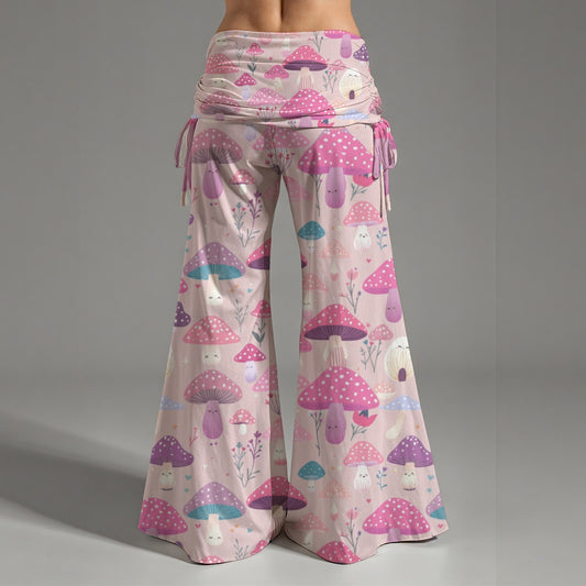 Pink Happy Mushroom Print High Waisted Wide Yoga Leggings