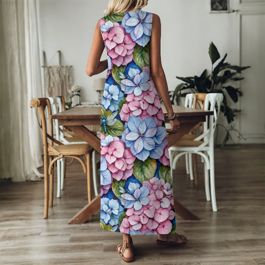 Garden Hydrangeas Dragonfly Flower All-Over Print Women's Gardening Floral V-Neck Long Dress