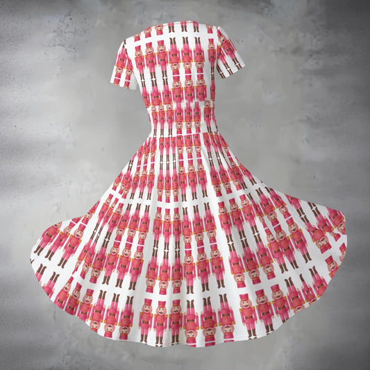 Hot-Pink Nutcracker Print Women's Short Sleeve V-Neck Midi Dress in White Christmas Holiday Fashion