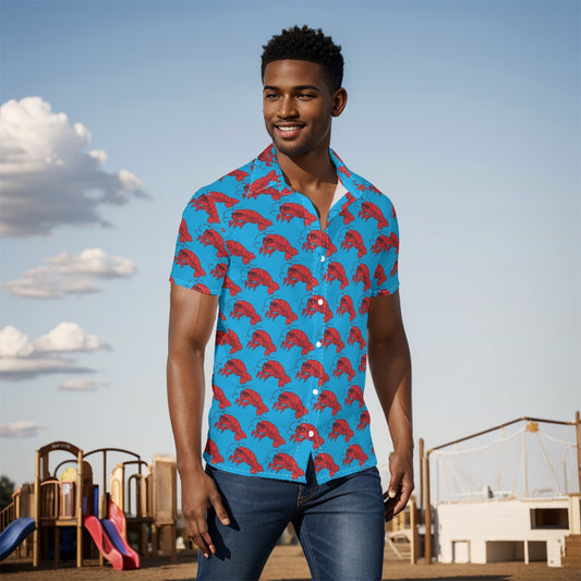 Blue Men's Button-Up Shirt with Smoking Lobster Print - Fun Cruise Style