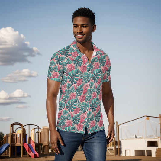 Men's Button-Up Shirt Pink Green Leaf Garden Print Breathable Stretch Fabric