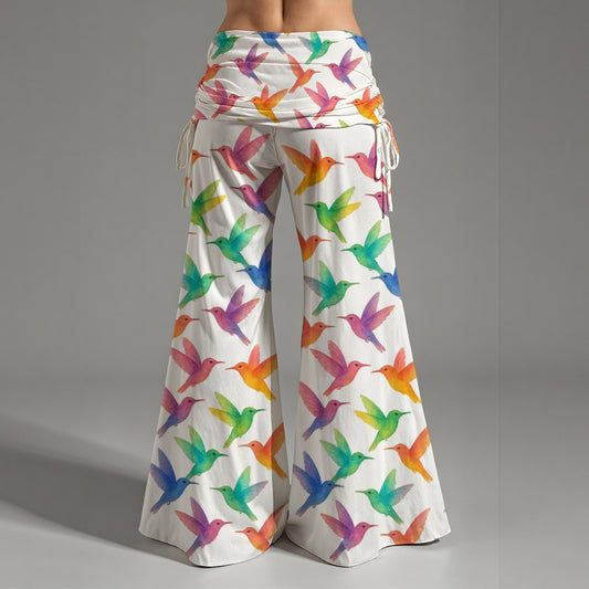 Women's High Waist Wide Leg Pants with Watercolor Rainbow Colorful Hummingbird Print