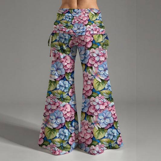 Women's Hippie Flare Pants with Hydrangeas Dragonfly Print High Waist Wide Leg Stylish Leggings