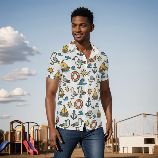 Men's Nautical Sailing Seagull Print Button Up Shirt Breathable Stretch Fabric for Cruise Vacations