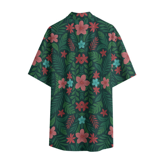 Men's Button-Up Shirt Pink Green Leaf Garden Print Breathable Stretch Fabric