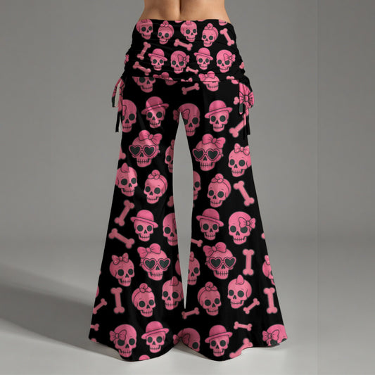 Pink Skulls & Bones High Waist Wide Leg Pants Women Alternative Hippie Rock Bell Bottoms Flare Style