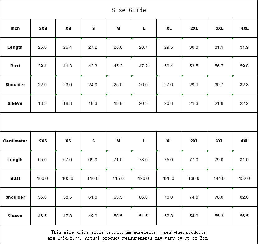 | Centimeter | 2XS | XS | S | M | L | XL | 2XL | 3XL | 4XL |