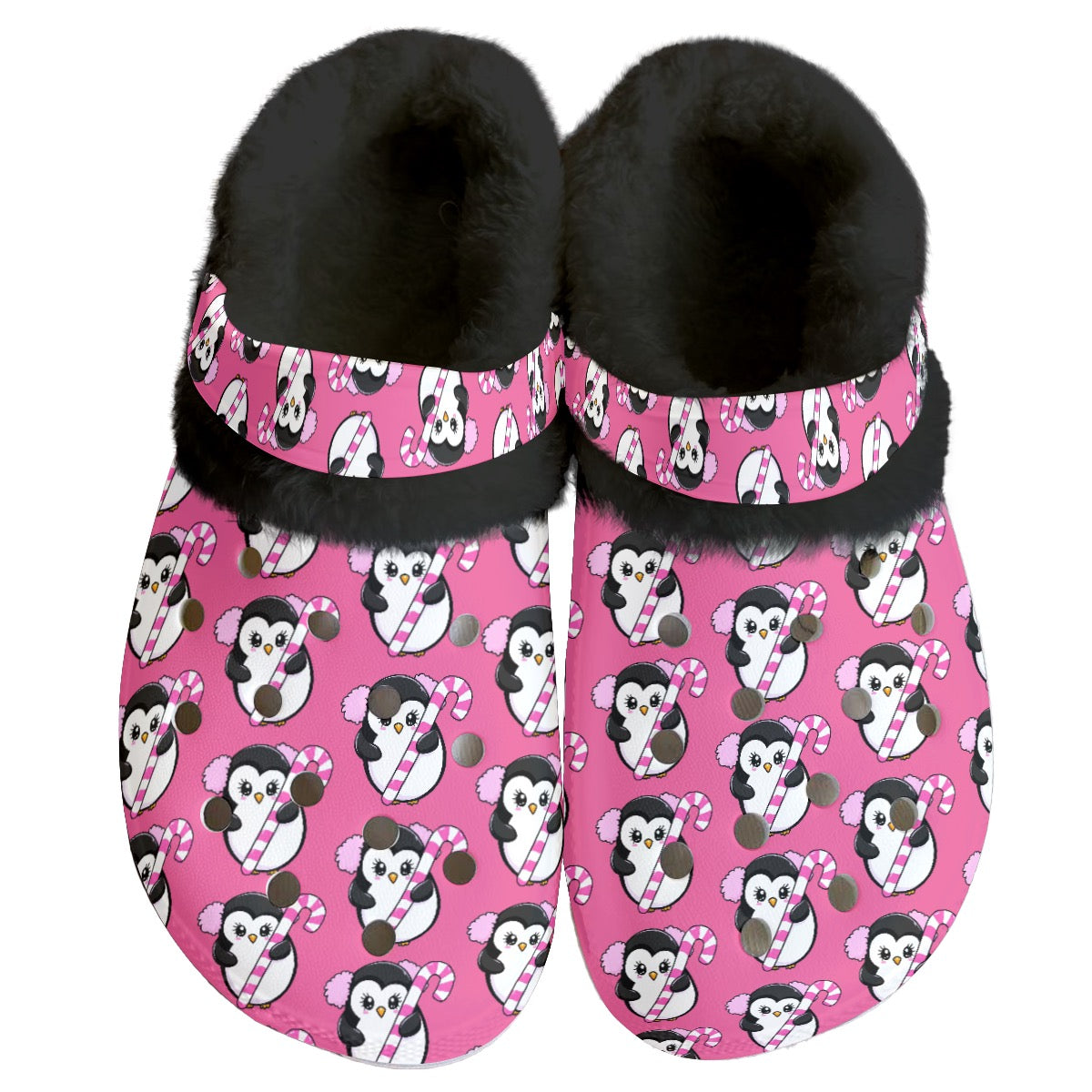 Hot Pink Holiday Penguin Candy Cane Fleece-Lined Clogs for Women Adorable Christmas