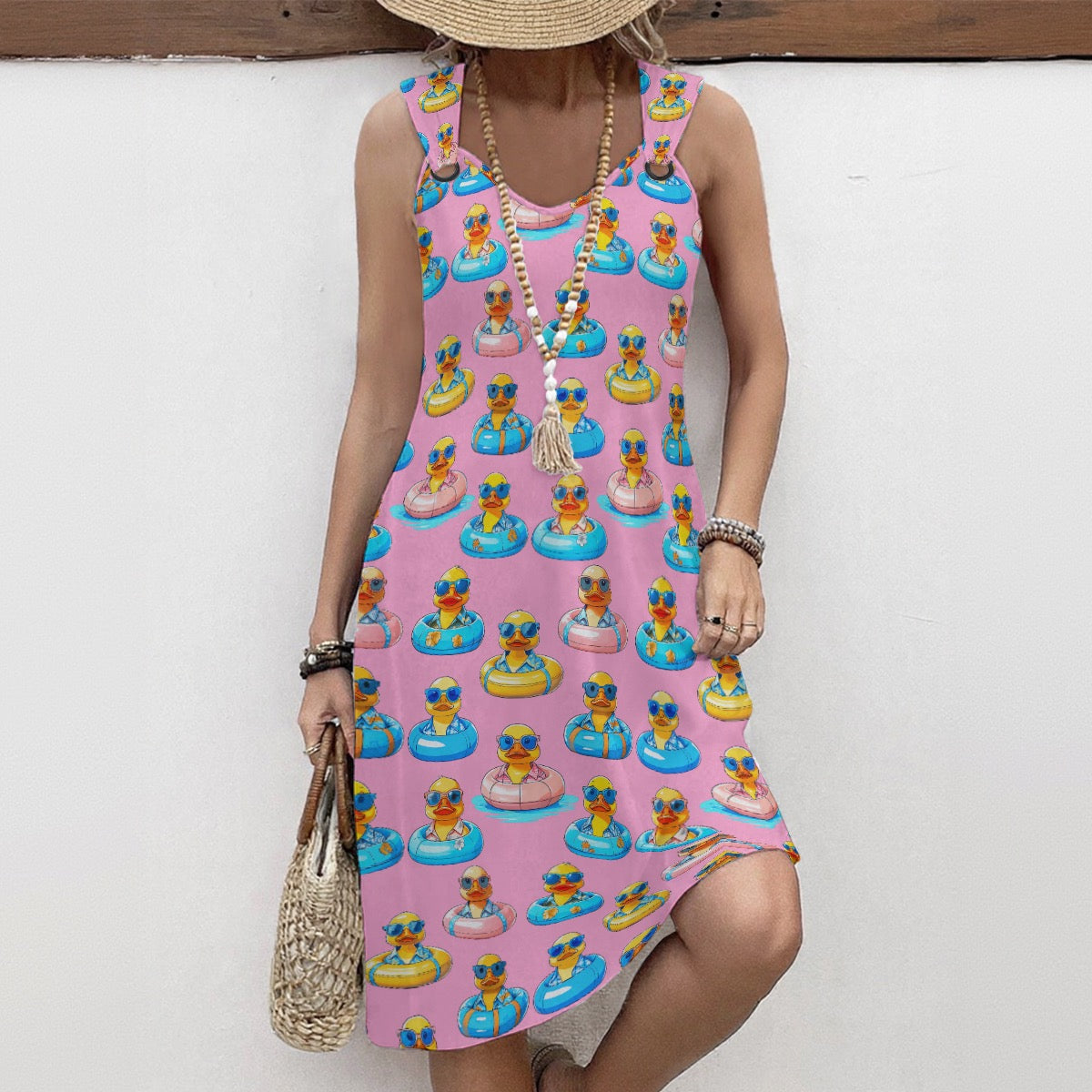 This women's hoop suspender dress features a playful pink rubber duck pool cruise print, celebrating charm and confidence. Designed to flatter every body shape, it's perfect for summer outings, beach vacations, or casual wear, offering a fashionable and comfortable experience with its sleek silhouette.