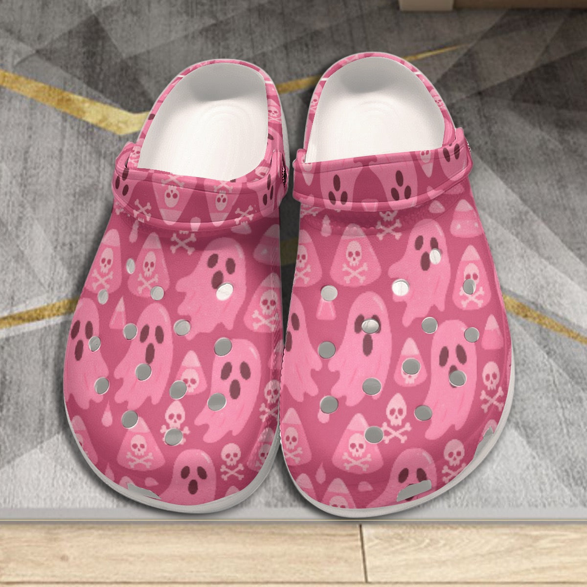 Women's Pink Spooky Ghost Skull Halloween Clogs by Crocs - Lightweight Anti-Slip EVA Sandals