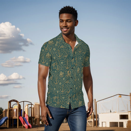 Men’s Vintage Nautical Cruise Button-Up Shirt Sea Green & Gold Vacation Shirt Classic Resort Wear